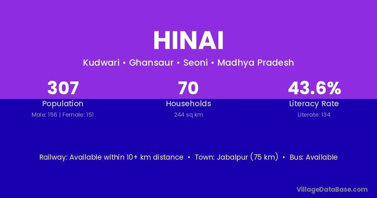 Jabalpur (75 km) is the nearest town to Hinai village for major economic activities and is located approximately 75 km away.