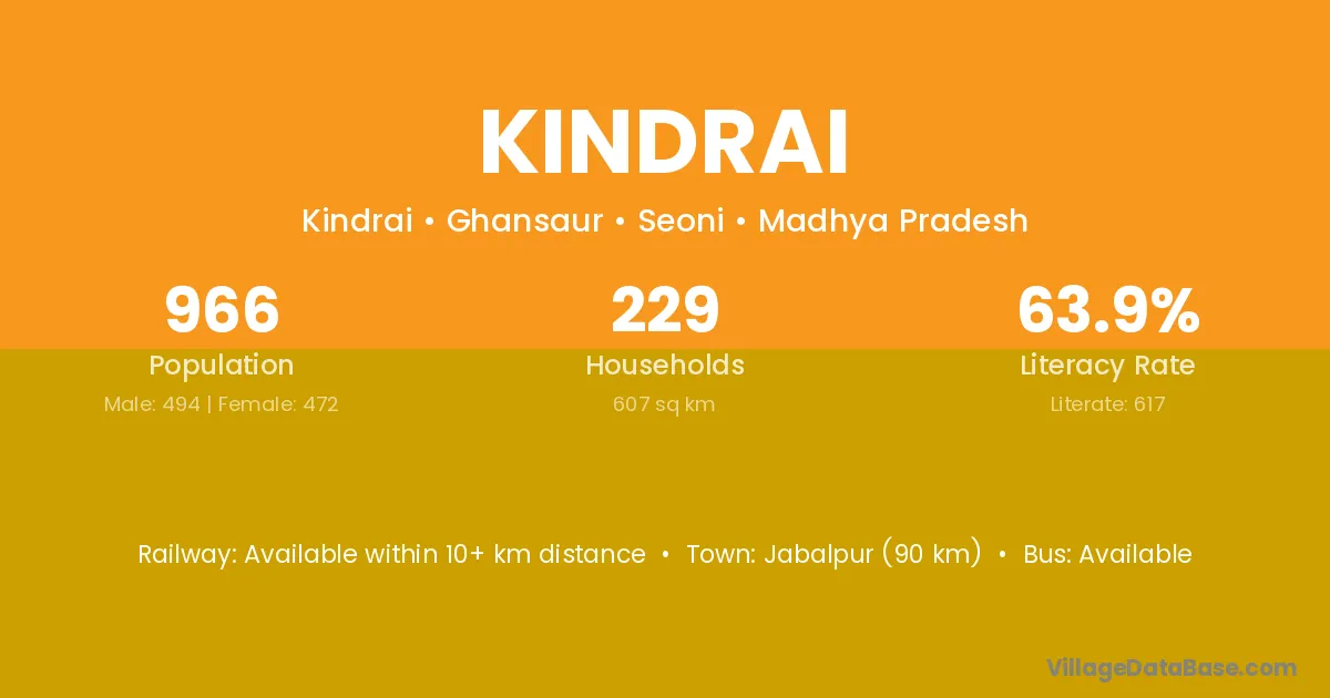 Jabalpur (90 km) is the nearest town to Kindrai village for major economic activities and is located approximately 90 km away.