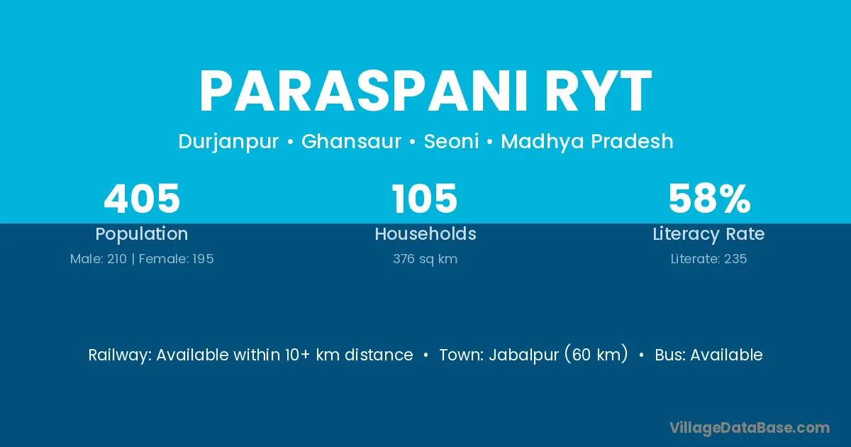 Jabalpur (60 km) is the nearest town to Paraspani Ryt village for major economic activities and is located approximately 60 km away.