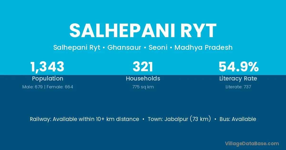 Jabalpur (73 km) is the nearest town to Salhepani Ryt village for major economic activities and is located approximately 73 km away.