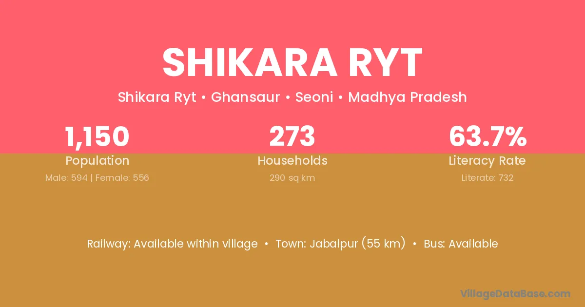 Jabalpur (55 km) is the nearest town to Shikara Ryt village for major economic activities and is located approximately 55 km away.