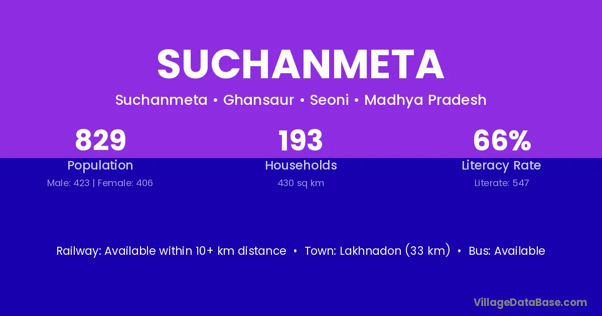 Lakhnadon (33 km) is the nearest town to Suchanmeta village for major economic activities and is located approximately 33 km away.