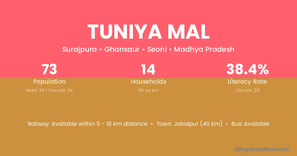 Tuniya Mal village has a total population of 73 people, of which 39 are males and 34 are females.