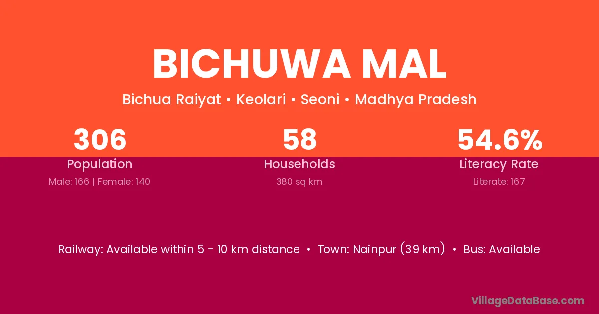 Nainpur (39 km) is the nearest town to Bichuwa Mal village for major economic activities and is located approximately 39 km away.