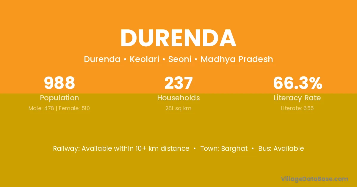 Durenda village has a total population of 988 people, of which 478 are males and 510 are females.