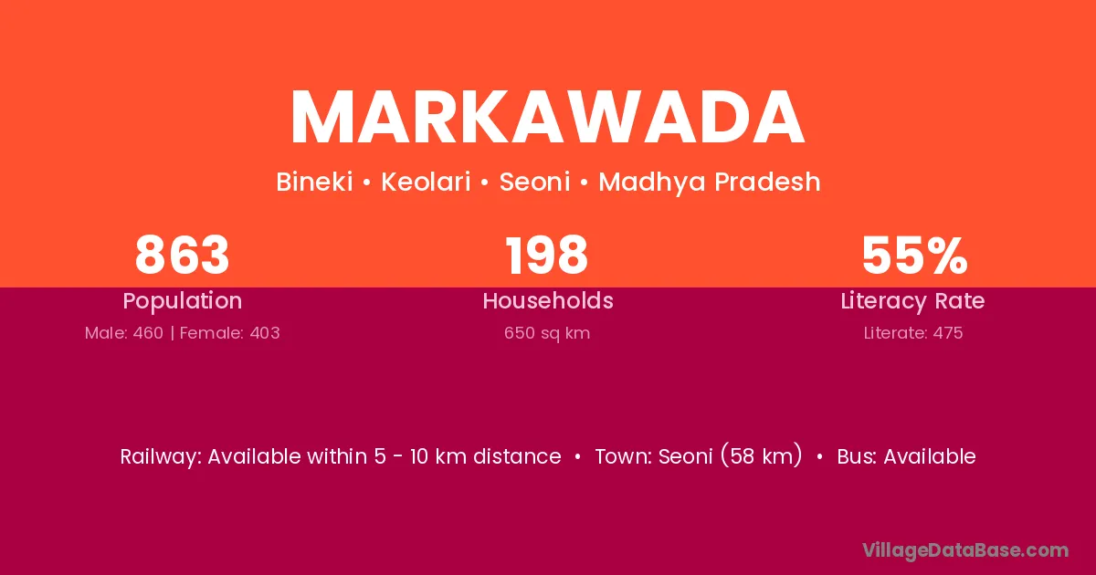 Seoni (58 km) is the nearest town to Markawada village for major economic activities and is located approximately 58 km away.