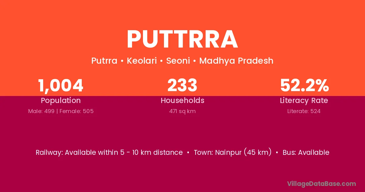 Puttrra village has a total population of 1,004 people, of which 499 are males and 505 are females.
