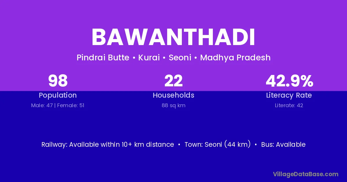 Seoni (44 km) is the nearest town to Bawanthadi village for major economic activities and is located approximately 44 km away.