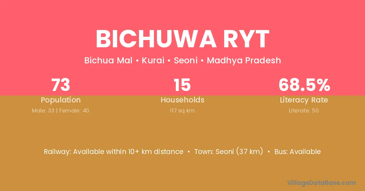 Seoni (37 km) is the nearest town to Bichuwa Ryt village for major economic activities and is located approximately 37 km away.