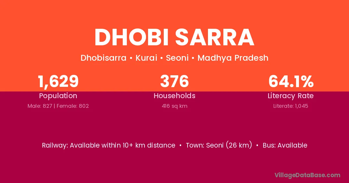 Seoni (26 km) is the nearest town to Dhobi Sarra village for major economic activities and is located approximately 26 km away.