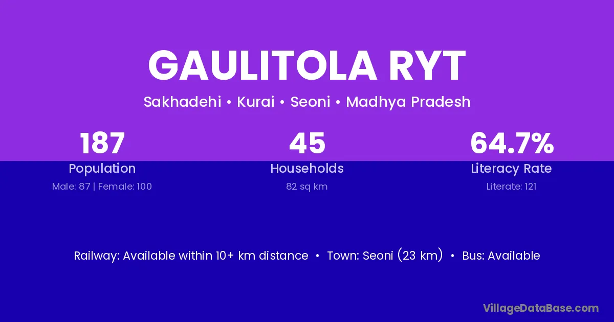 Seoni (23 km) is the nearest town to Gaulitola Ryt village for major economic activities and is located approximately 23 km away.