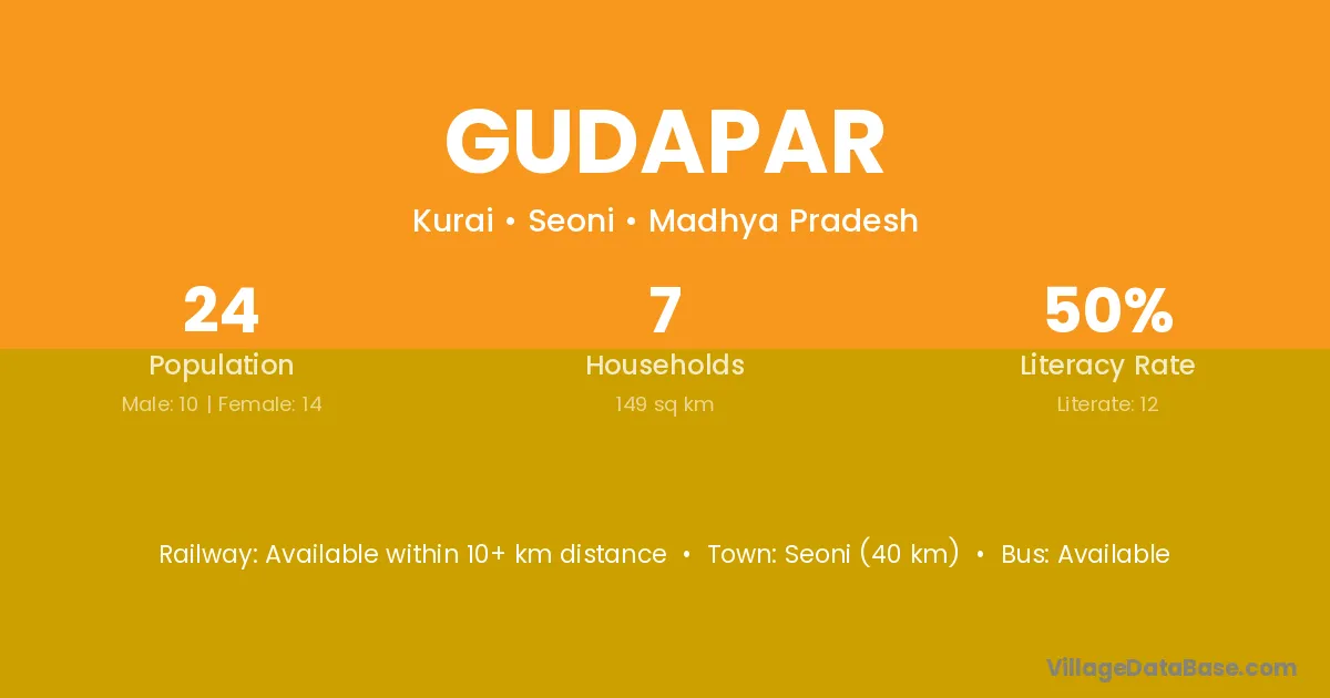 Seoni (40 km) is the nearest town to Gudapar village for major economic activities and is located approximately 40 km away.