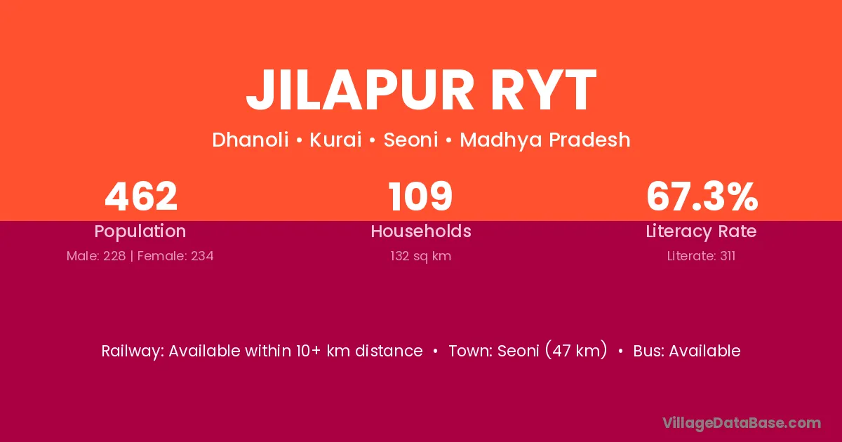 Seoni (47 km) is the nearest town to Jilapur Ryt village for major economic activities and is located approximately 47 km away.