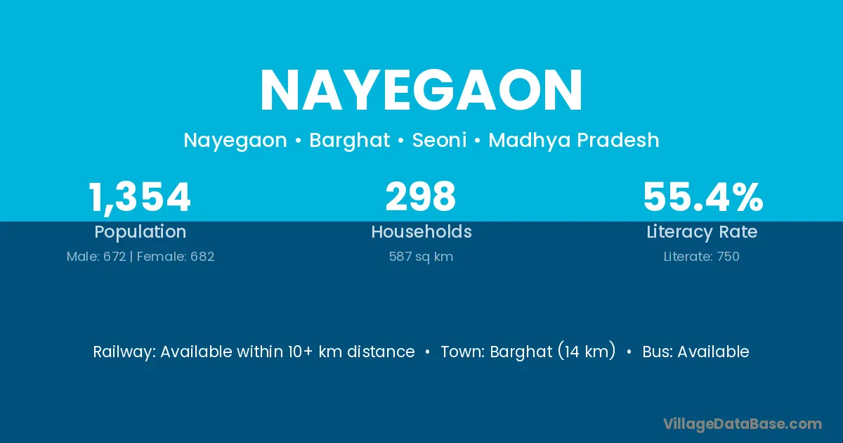 Seoni (23 km) is the nearest town to Nayegaon village for major economic activities and is located approximately 23 km away.