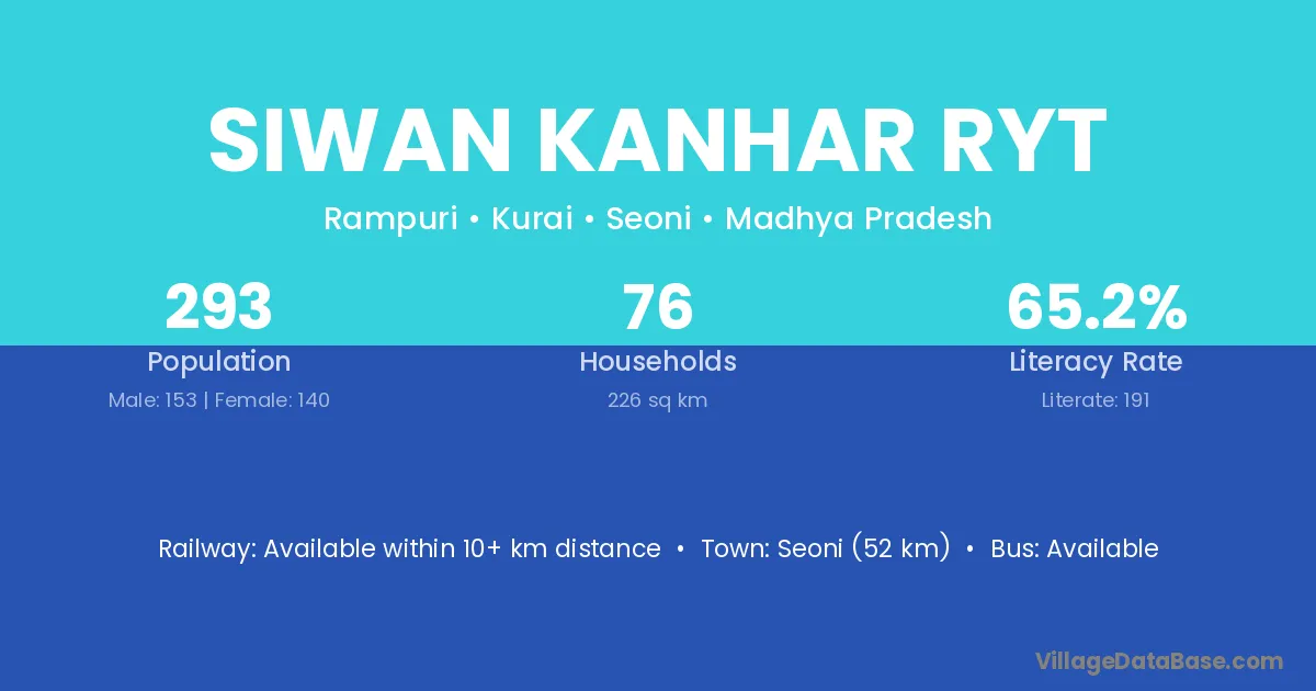 Seoni (52 km) is the nearest town to Siwan Kanhar Ryt village for major economic activities and is located approximately 52 km away.