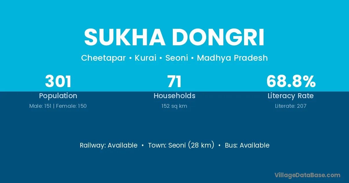 Sukha Dongri village has a total population of 301 people, of which 151 are males and 150 are females.