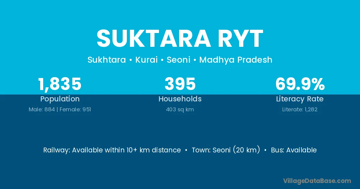 Seoni (20 km) is the nearest town to Suktara Ryt village for major economic activities and is located approximately 20 km away.