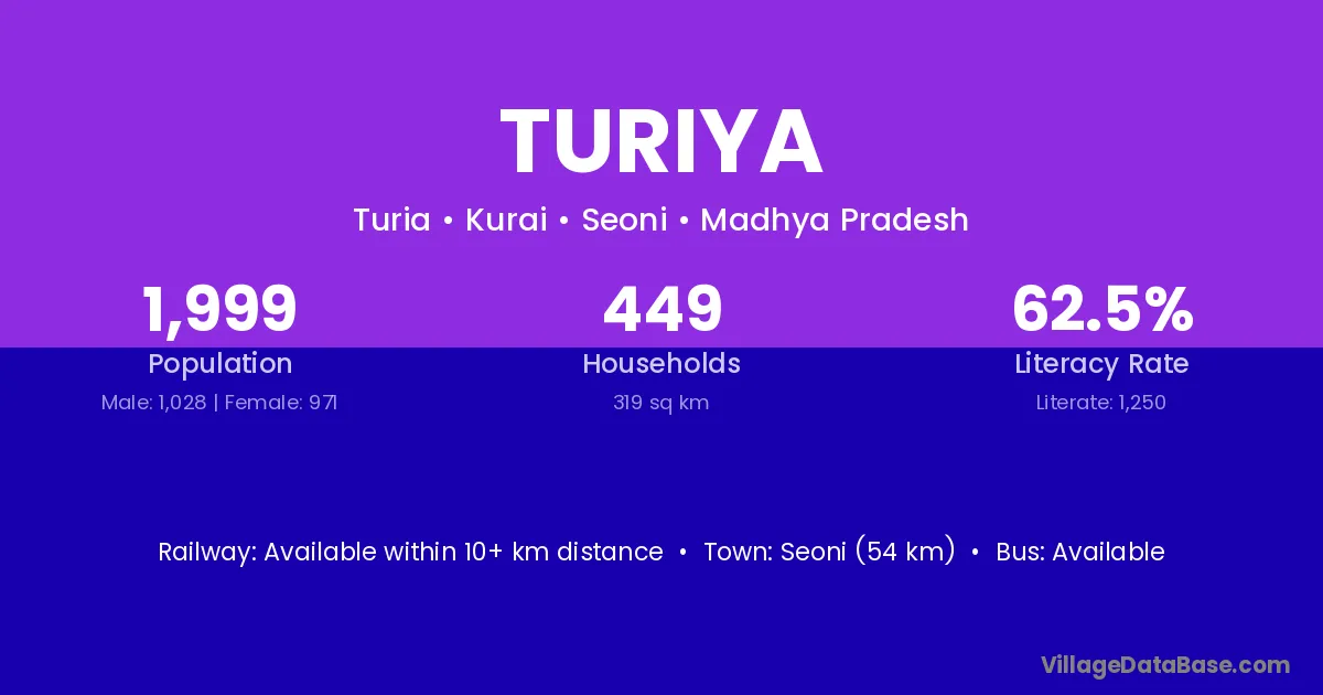 Seoni (54 km) is the nearest town to Turiya village for major economic activities and is located approximately 54 km away.