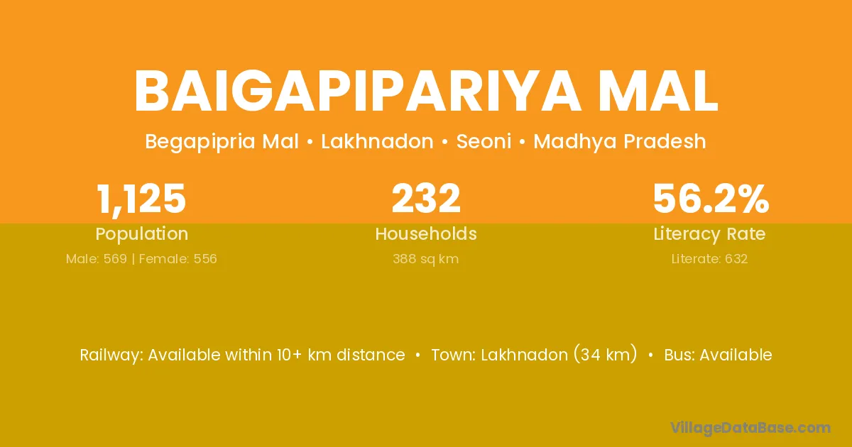 Baigapipariya Mal village has a total population of 1,125 people, of which 569 are males and 556 are females.