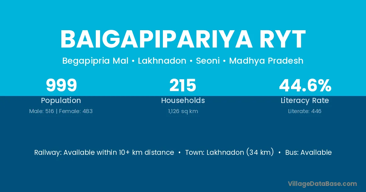 Lakhnadon (34 km) is the nearest town to Baigapipariya Ryt village for major economic activities and is located approximately 34 km away.