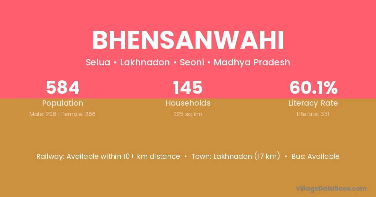 Lakhnadon (17 km) is the nearest town to Bhensanwahi village for major economic activities and is located approximately 17 km away.