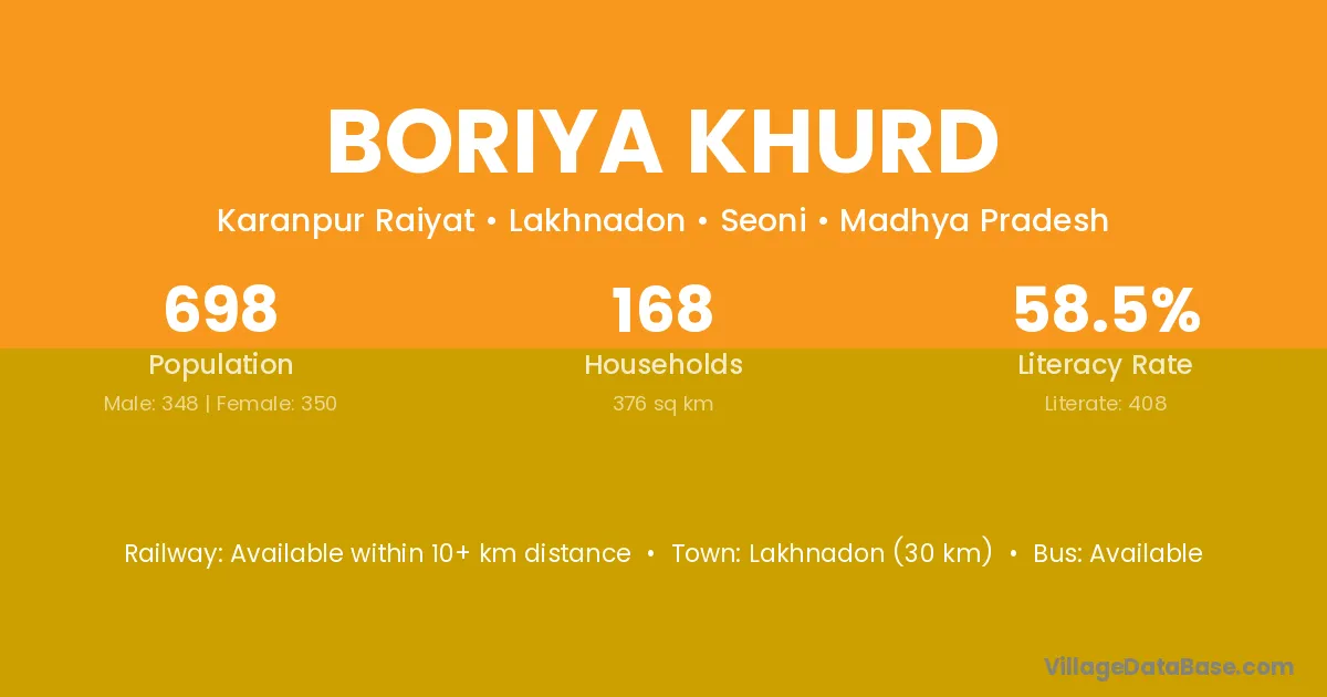 Boriya Khurd village has a total population of 698 people, of which 348 are males and 350 are females.