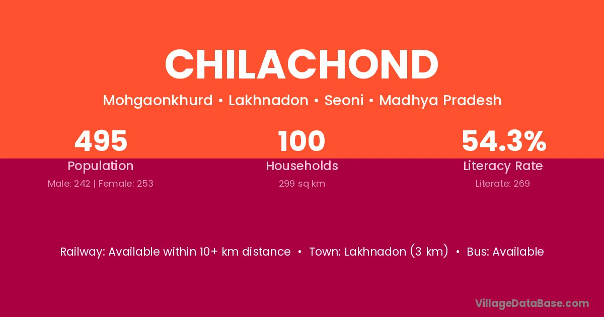 Lakhnadon (3 km) is the nearest town to Chilachond village for major economic activities and is located approximately 3 km away.