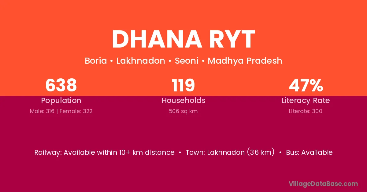 Lakhnadon (36 km) is the nearest town to Dhana Ryt village for major economic activities and is located approximately 36 km away.