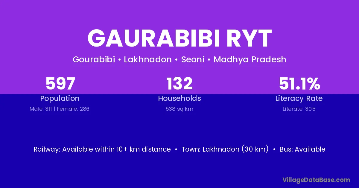 Lakhnadon (30 km) is the nearest town to Gaurabibi Ryt village for major economic activities and is located approximately 30 km away.