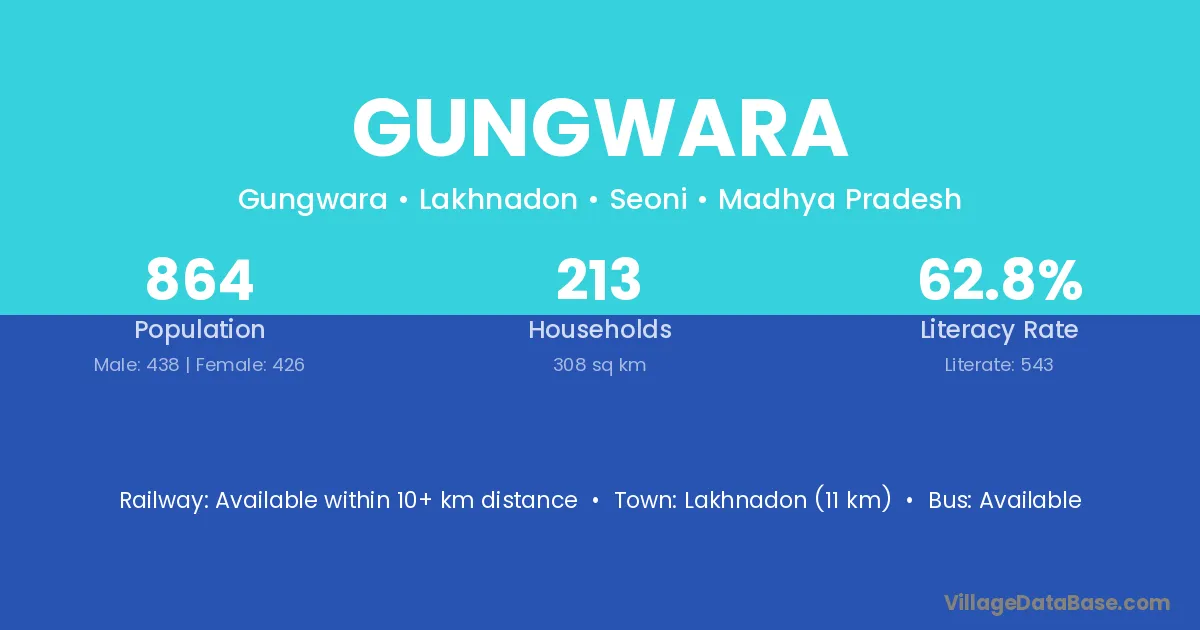 Lakhnadon (11 km) is the nearest town to Gungwara village for major economic activities and is located approximately 11 km away.