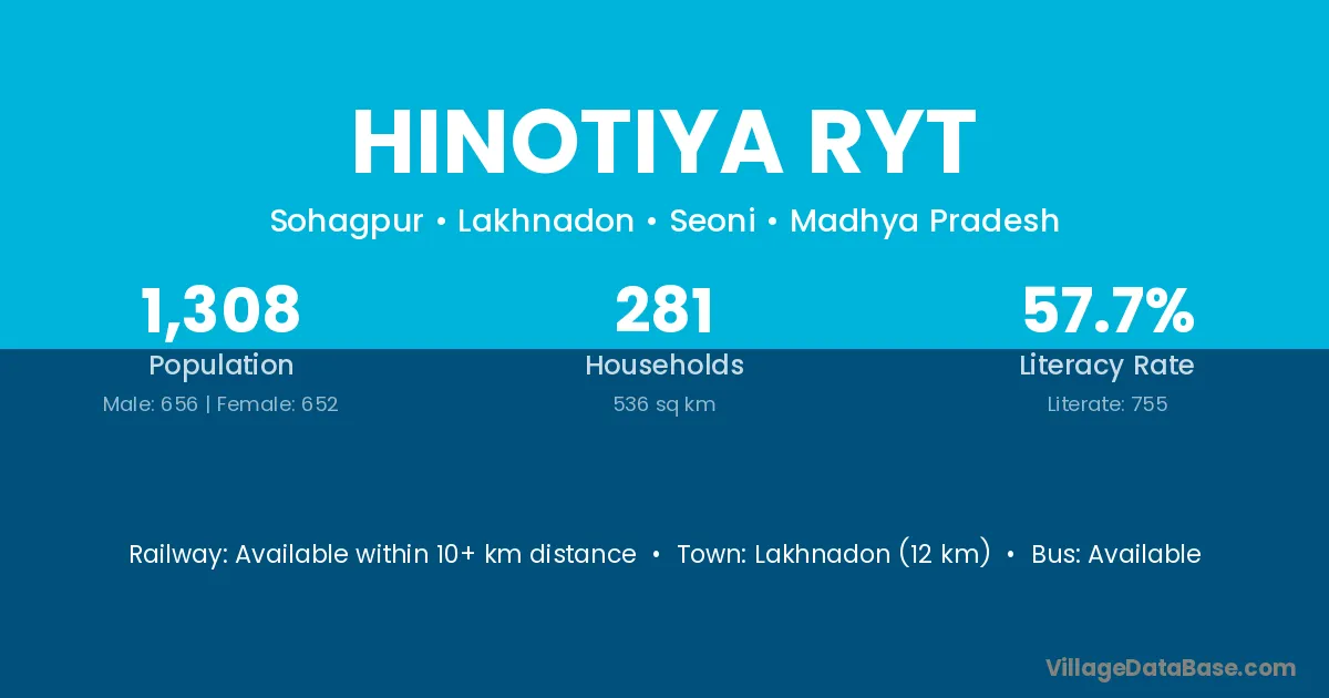 Lakhnadon (12 km) is the nearest town to Hinotiya Ryt village for major economic activities and is located approximately 12 km away.
