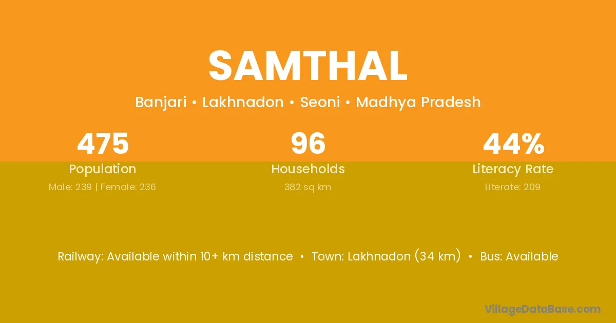 Lakhnadon (34 km) is the nearest town to Samthal village for major economic activities and is located approximately 34 km away.