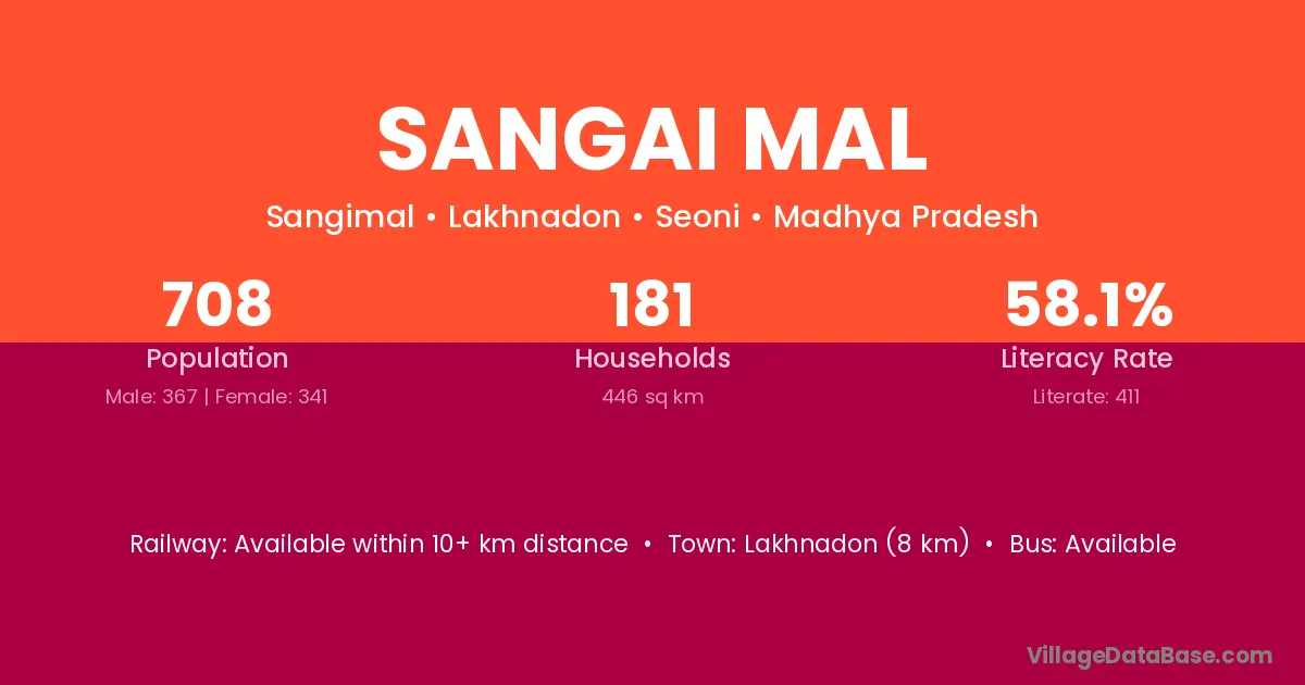 Lakhnadon (8 km) is the nearest town to Sangai Mal village for major economic activities and is located approximately 8 km away.