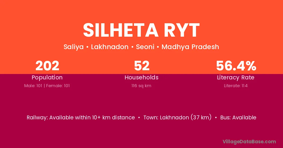 Lakhnadon (37 km) is the nearest town to Silheta Ryt village for major economic activities and is located approximately 37 km away.