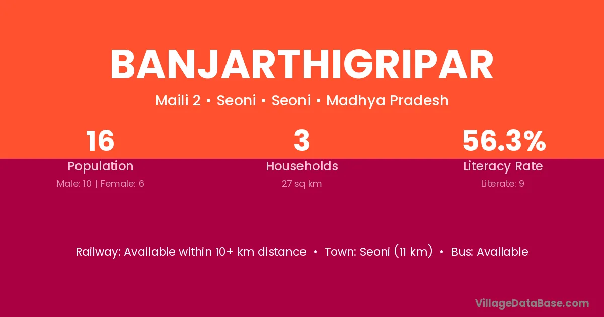Seoni (11 km) is the nearest town to Banjarthigripar village for major economic activities and is located approximately 11 km away.