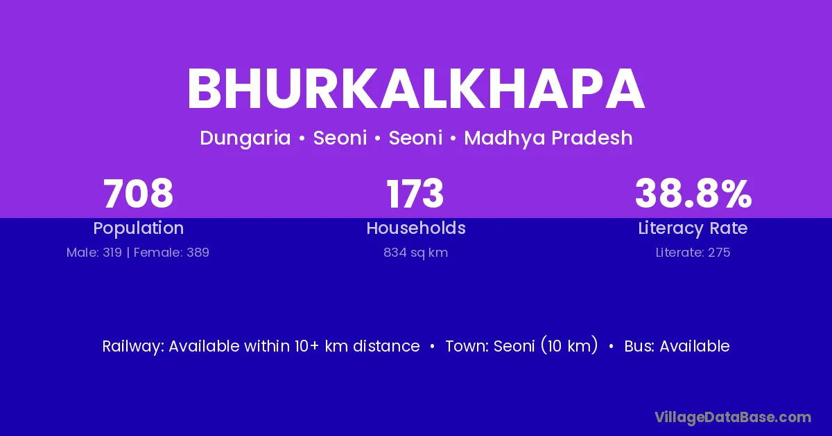 Seoni (10 km) is the nearest town to Bhurkalkhapa village for major economic activities and is located approximately 10 km away.