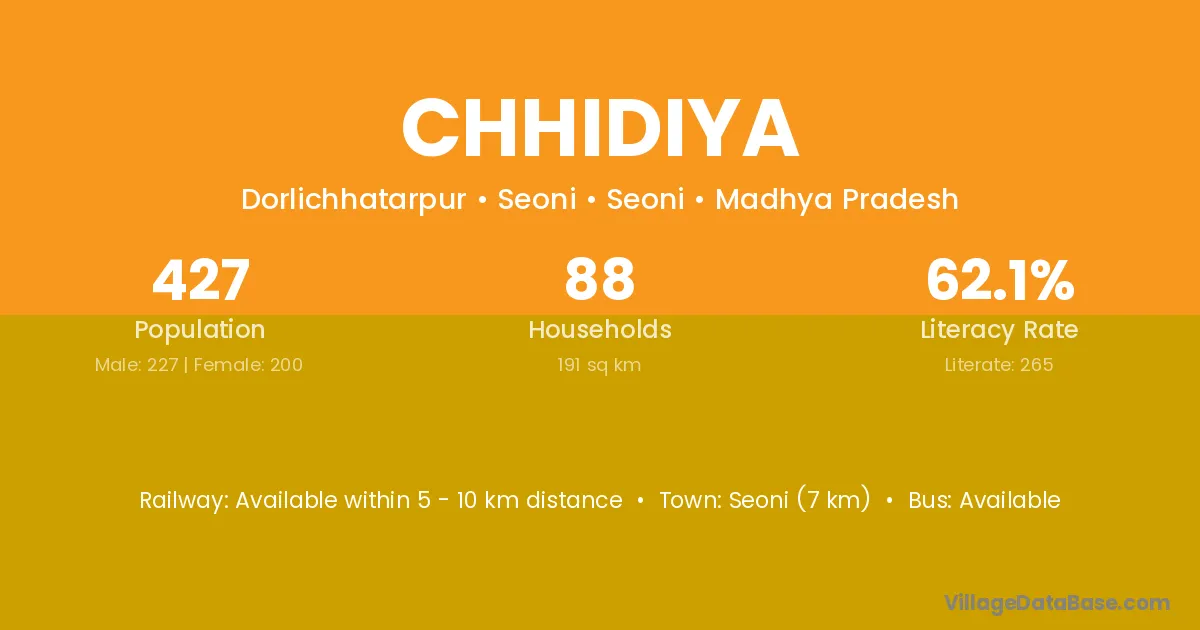 Seoni (7 km) is the nearest town to Chhidiya village for major economic activities and is located approximately 7 km away.