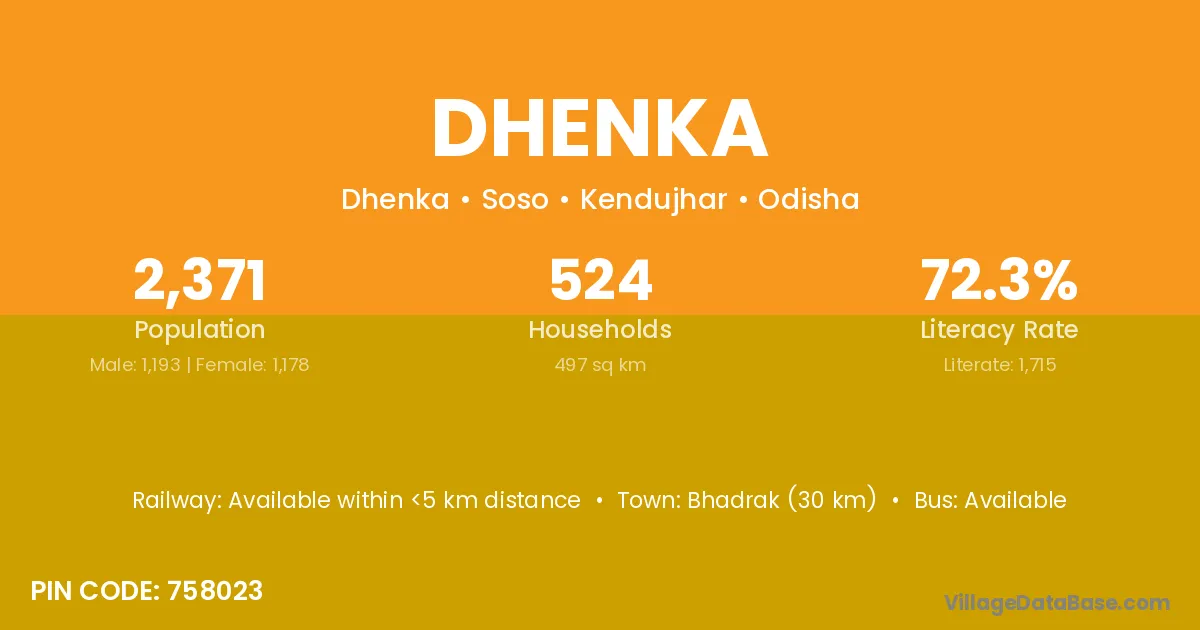 The literacy rate of Dhenka village is 57.31%. Male literacy stands at 65.74% and female literacy at 48.39%.