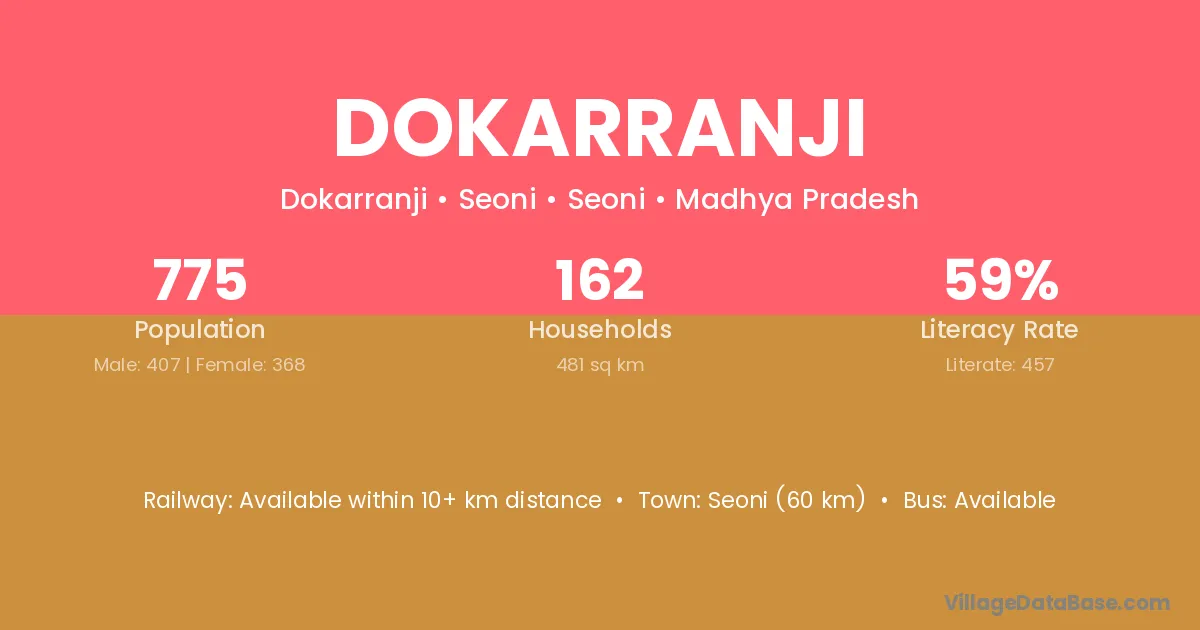 Seoni (60 km) is the nearest town to Dokarranji village for major economic activities and is located approximately 60 km away.