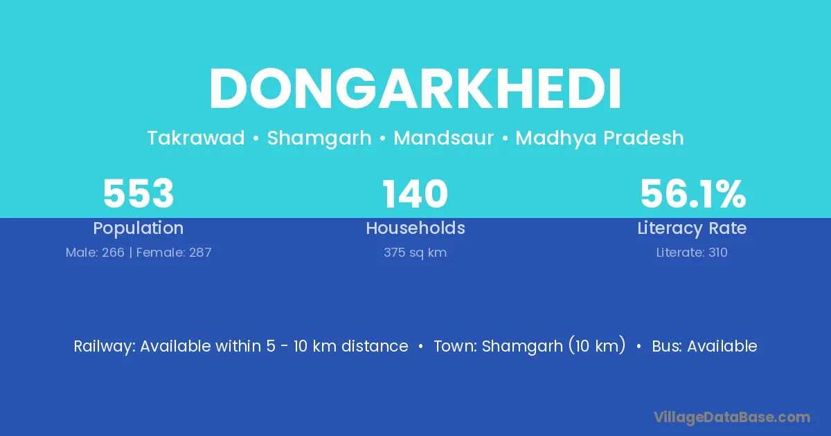 Seoni (14 km) is the nearest town to Dongarkhedi village for major economic activities and is located approximately 14 km away.