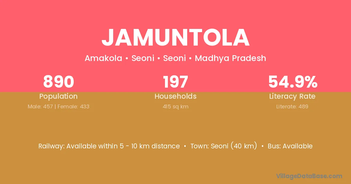 Seoni (40 km) is the nearest town to Jamuntola village for major economic activities and is located approximately 40 km away.