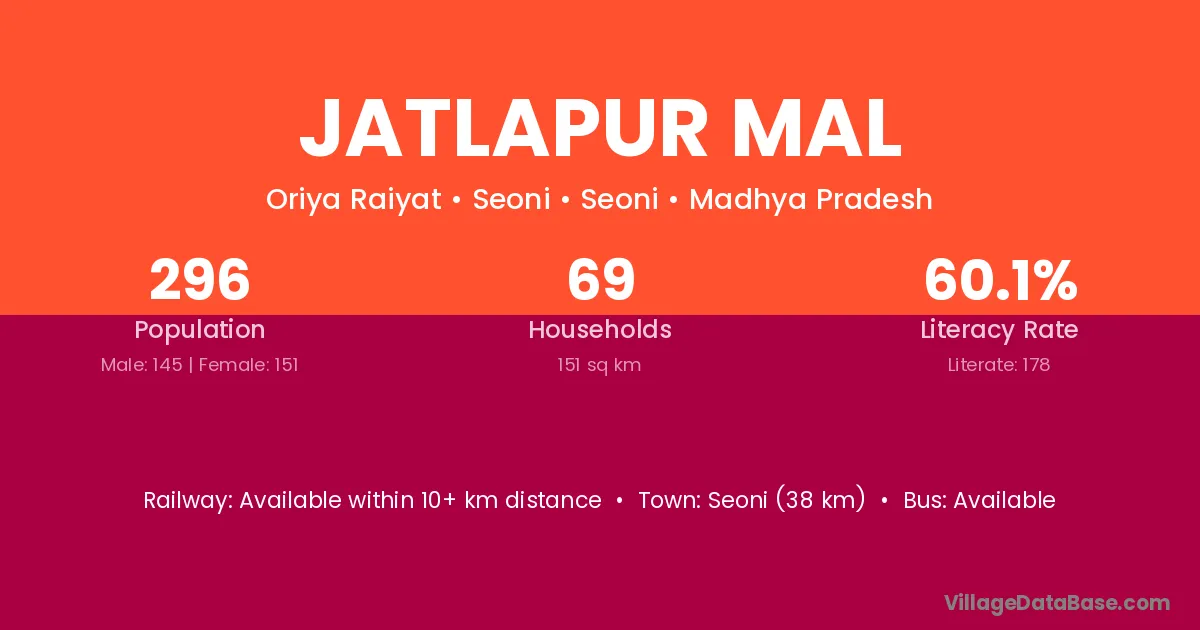 Seoni (38 km) is the nearest town to Jatlapur Mal village for major economic activities and is located approximately 38 km away.