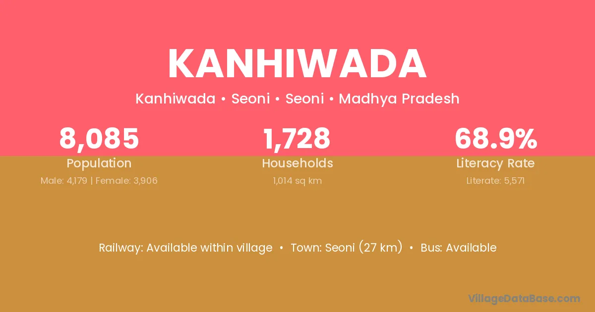 Seoni (27 km) is the nearest town to Kanhiwada village for major economic activities and is located approximately 27 km away.