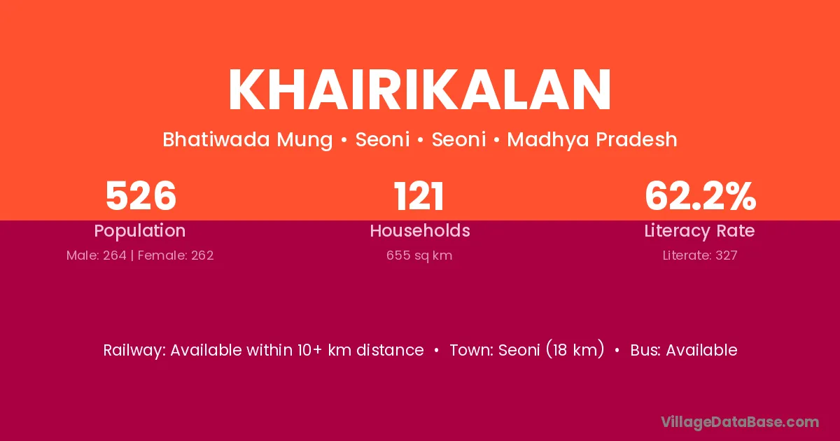 Seoni (18 km) is the nearest town to Khairikalan village for major economic activities and is located approximately 18 km away.