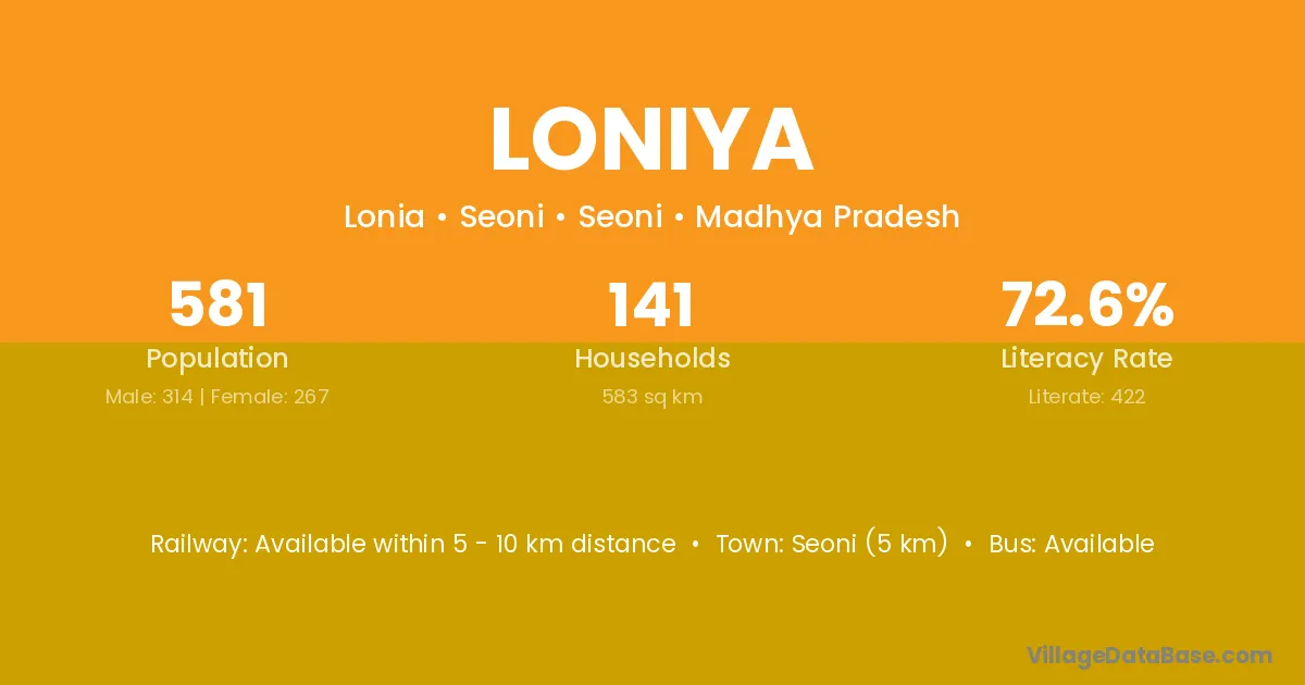 Seoni (5 km) is the nearest town to Loniya village for major economic activities and is located approximately 5 km away.
