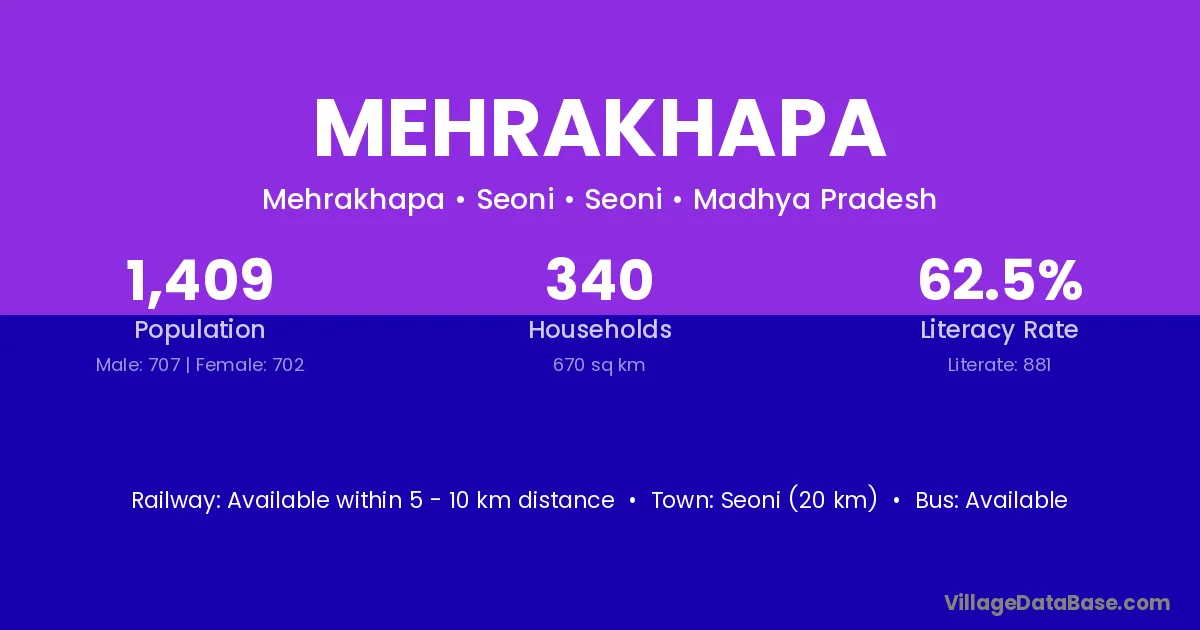 Seoni (20 km) is the nearest town to Mehrakhapa village for major economic activities and is located approximately 20 km away.