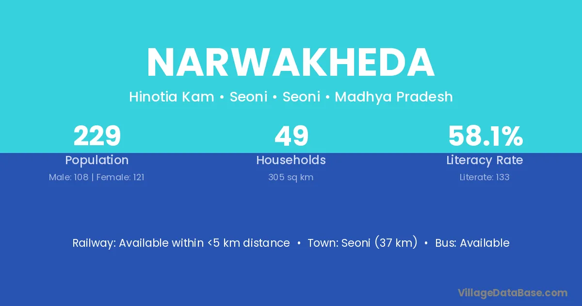Seoni (37 km) is the nearest town to Narwakheda village for major economic activities and is located approximately 37 km away.