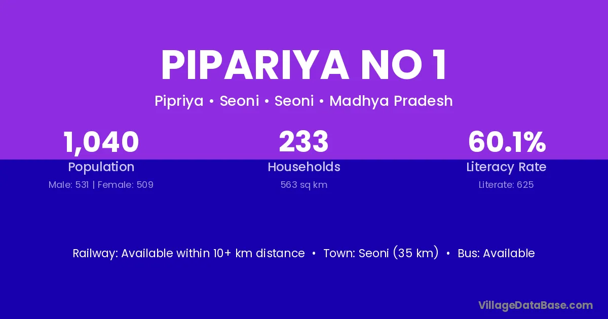 Seoni (35 km) is the nearest town to Pipariya No 1 village for major economic activities and is located approximately 35 km away.