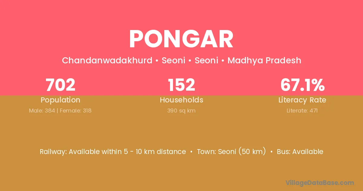 Seoni (50 km) is the nearest town to Pongar village for major economic activities and is located approximately 50 km away.