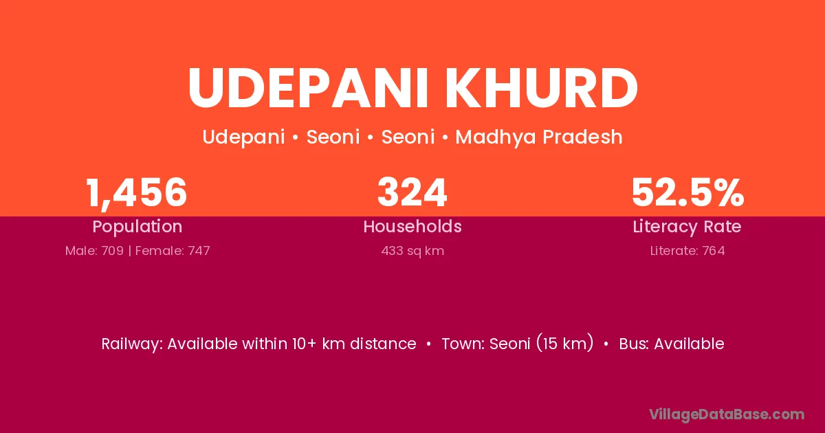 Seoni (15 km) is the nearest town to Udepani Khurd village for major economic activities and is located approximately 15 km away.